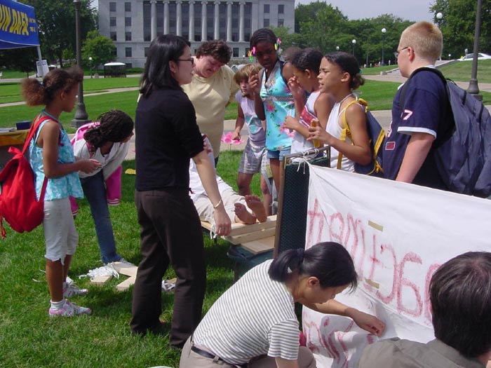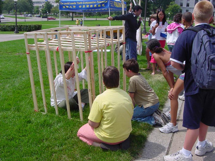 的真象。有一家媒体的记者和学员谈了很久,并对学员赠与的《伪火》 VCD 表示感谢。一位中学生认真地在纸上画着每一位做酷刑表演的学员。一群小孩得知学员可以教他们炼功时特别高兴。市府大楼草坪的周围有一些公司的办公大楼,有的职员告诉学员,从楼上就可以看到我们在这里有活动。