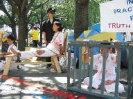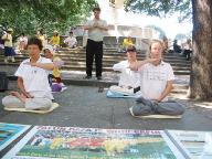 另一个妈妈带着四个小女孩,其中三个是她的女儿,肚子里还有一个小宝宝。她那三个活泼可爱的女儿学着法轮功学员的样子在那里盘起腿来。