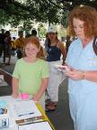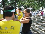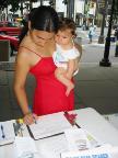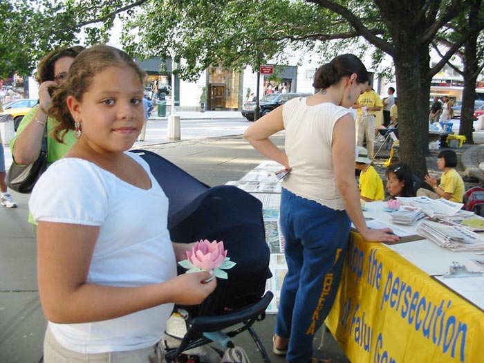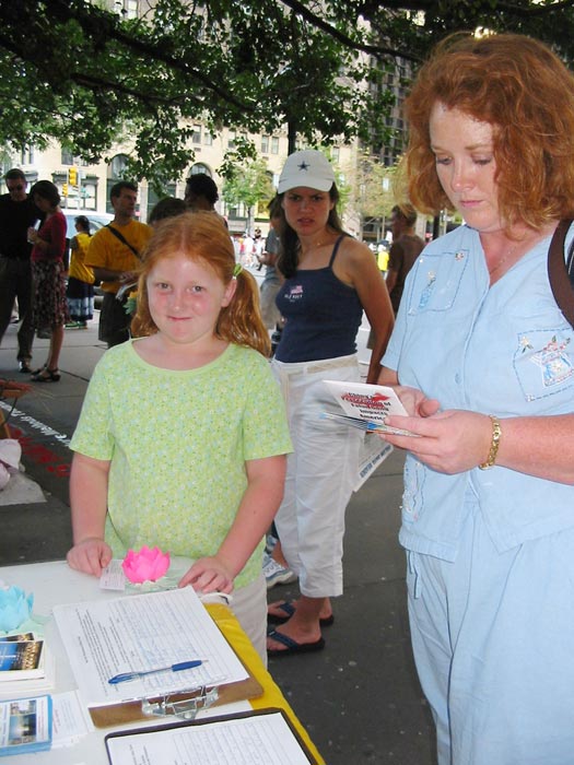 一位推着儿童小车的年轻女性走过来,她站在展板前静静的看了起来。过了一会儿,一个身穿黄色T恤衫的小伙子与她交谈了起来。小伙子向她介绍了什么是法轮功,法轮功在中国遭到的迫害等等。之后,她在“停止迫害”的签名本上写上了自己的名字。这时,另一个法轮功学员将一朵淡黄色的莲花送给了童车中的小婴孩,小婴孩卷卷的头发,瞪着一双大大的眼睛,兴奋的接过了莲花。