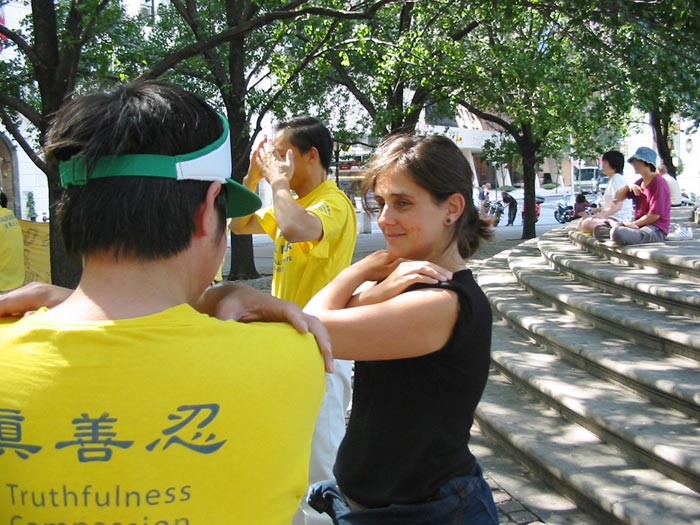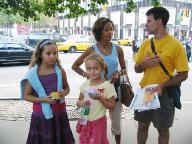 来自西班牙的一家四口,他们童车中的小婴儿今天刚好满两个月。小孩的妈妈对法轮功非常感兴趣,当场就跟学员们学起了动功。当夫妻两个在签完名后,看到我在给他们的小女孩照相,孩子的父亲把他手中的相机递给我,让我给他们全家也在这儿照上一张。