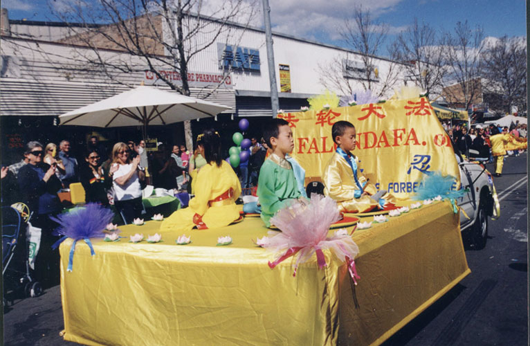 中午12点时,迎春游行开始了,当法轮功学员的队伍出现时,主持人说:“这是法轮功学员,他们的信仰是‘真、善、忍’。”