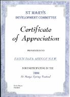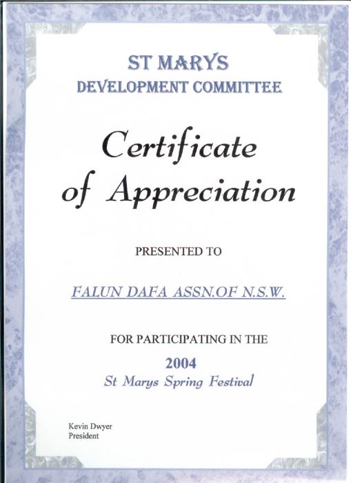圣玛丽斯镇发展委员会为感谢法轮功学员特颁发了感谢状。发展委员会主席凯文(Kevin Dwyer)在致法轮大法协会的感谢状中,感谢法轮功学员们参加2004年圣玛丽斯迎春活动。