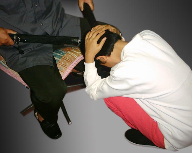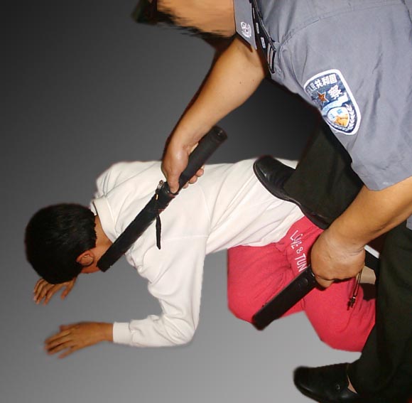 ![]() 壁虎爬墙 | ![]() 男队长坐在椅子上用穿着皮鞋的脚底蹭女法轮功学员的脸和嘴,还把两腿搭在她们的肩上夹住头往前拽,進行人格侮辱,用电棍电击脸、手。 | ![]() 队长电击炼功的学员,每个人至少被两根电棍电,有的是三根,还有用四根的,专往头、脸、嘴上电。 |