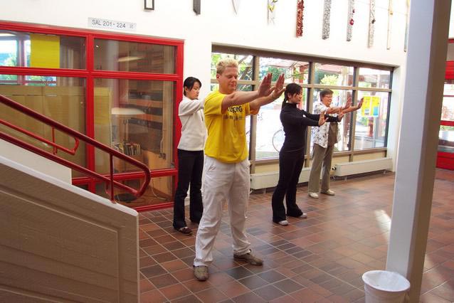 学员应邀给参加演讲会的人们展示功法并介绍法轮功。让来来走走的人们有机会观看法轮功五套有助身心的美好祥和的功法。很多人接受了相关介绍资料,其中包括法轮功在莱荣市炼功点炼功的时间和地点。