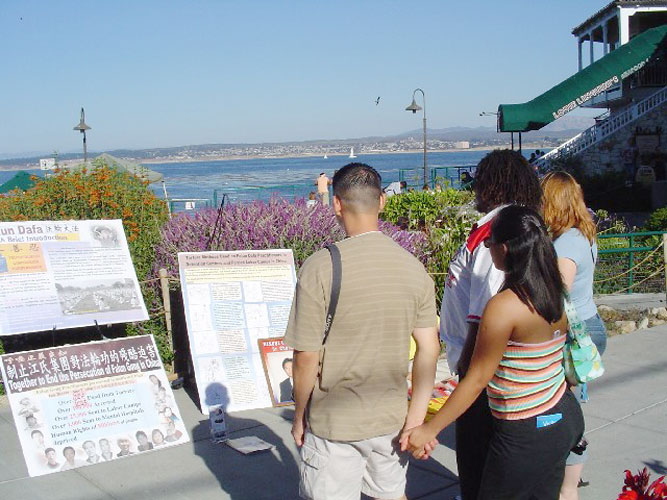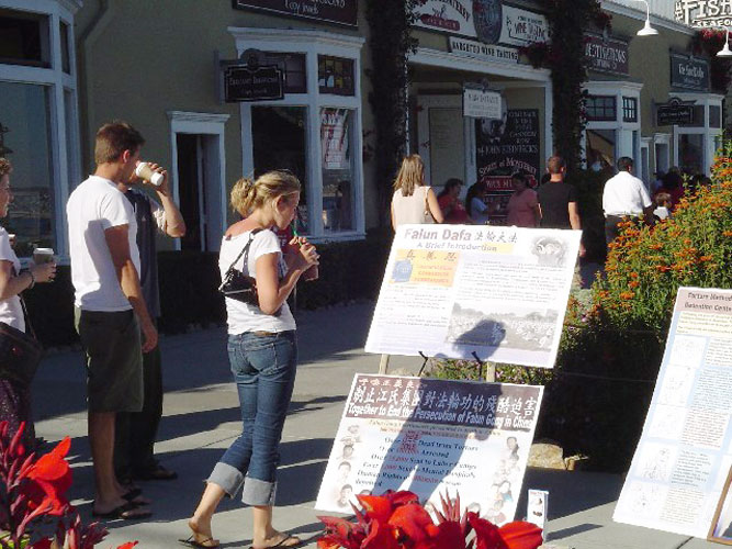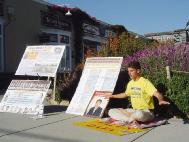 两名学员放置了讲真象展板和传单,并轮换着向行人做功法演示,讲真象。 一名女士特意走到一名学员面前诚挚的说:“谢谢你做的这一切。”另一名学员在做第五套功法时,一位墨西哥籍美国小男孩儿自己坐下来,和这名学员一起炼功。他的动作很准确!