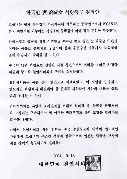 因此天安市议会全体议员作出决定,强烈要求中国公安当局从人道主义立场出发,无条件释放并保证高成女安全抵达韩国。