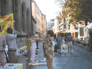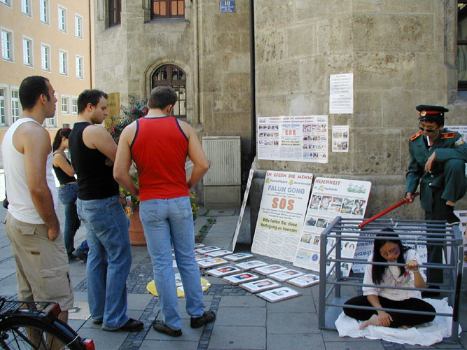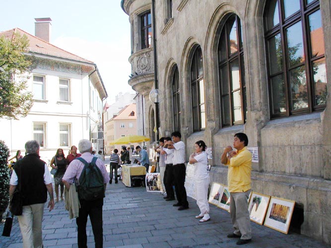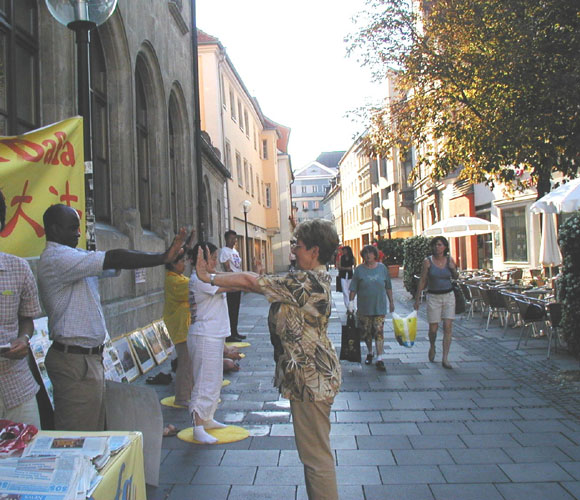 ![]() 德国拜恩州学员举办法轮大法信息日活动 | ![]() 人们被酷刑迫害图片和演示所吸引,了解迫害真象 | ![]() 当场就和学员们一起炼功 |