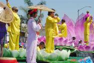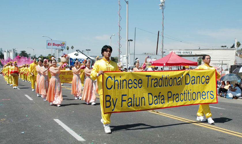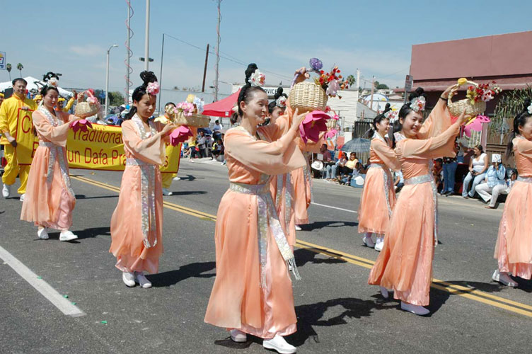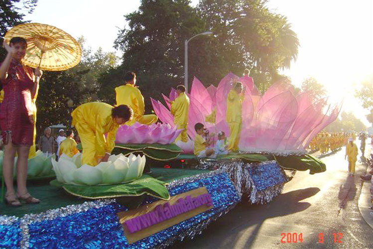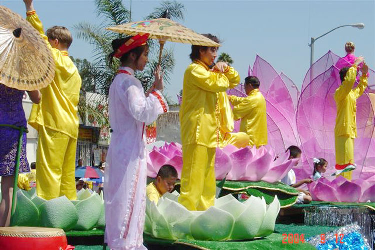 法轮功学员制作的高雅的花车、优美的功法表演、传统的中国舞蹈以及雄壮的腰鼓,受到了沿途观众的热烈欢迎。