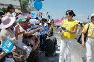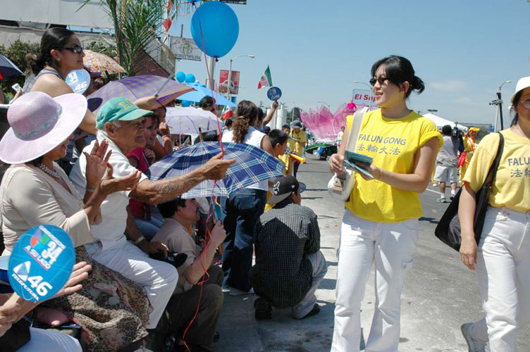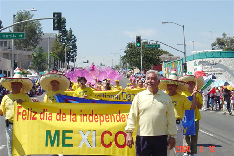 ![]() 法轮功学员的游行队伍 | ![]() 学员戴着墨西哥式传统大草帽、打着西班牙文标语,向墨裔人民祝贺节日 |