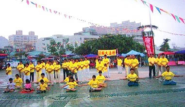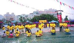 到了中午主办单位还在现场办了好几桌佳肴,宴请各地前来表演的原住民朋友及前来参观的所有民众,表现出原住民朋友好客的一面。这场午宴结束后,下午的节目随即开始,很快的就轮到当天唯一非原住民的表演团体──法轮功学员功法表演。这是由板桥、土城、树林各地的法轮功学员共同参与表演五套功法。但是,一上场就开始下雨了,这时,主持人鼓励着说:“原住民朋友不怕雨,照样表演,法轮功的朋友,应该也可以。”