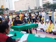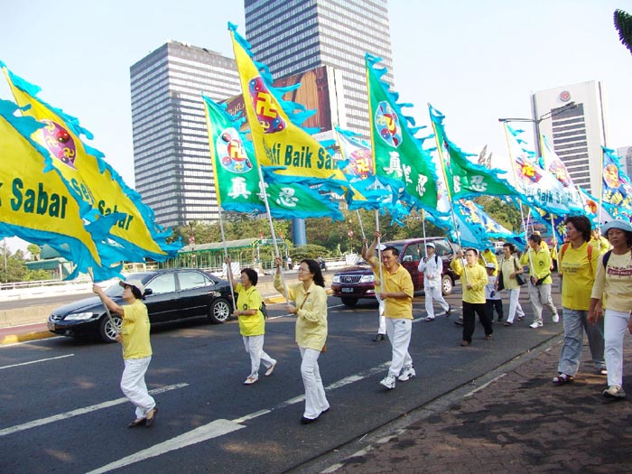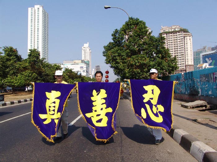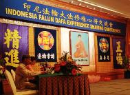 印尼旅游局局长向法会致贺,前国家政协副主席则是第一次出席法轮大法修炼心得交流会。台湾法轮大法学会给法会致以贺电:“在此邪恶猖獗,黑白不分的时世,印尼法轮功协会突破艰难的环境,顺利召开2004年全印尼的修炼心得交流会,祝大会成功。让更多的世人了解法轮功受迫害的真象,使学员真正符合正法时期的要求,做一个能走出来证实法,助师正法及救度众生的正法时期伟大弟子。”会场两边“正悟”“精進”两大型幅条,非常耀眼,会场布置庄严神圣。