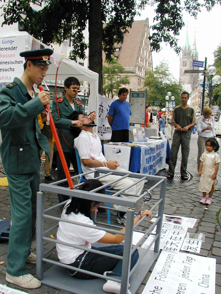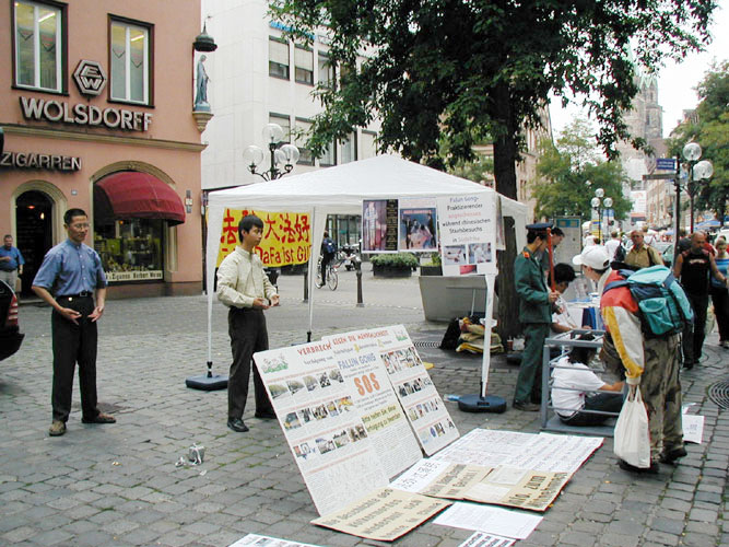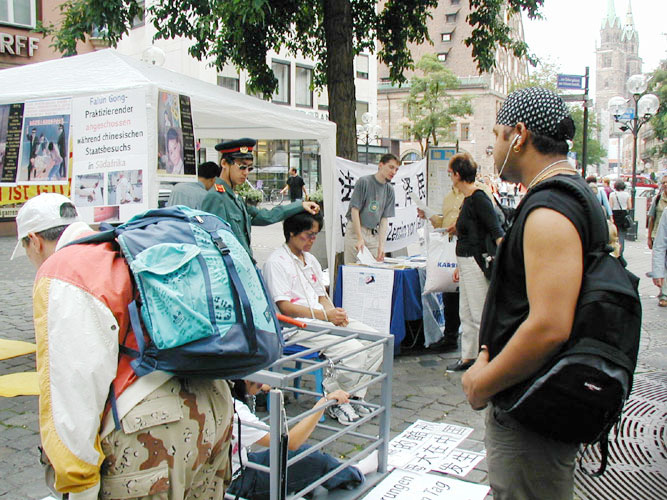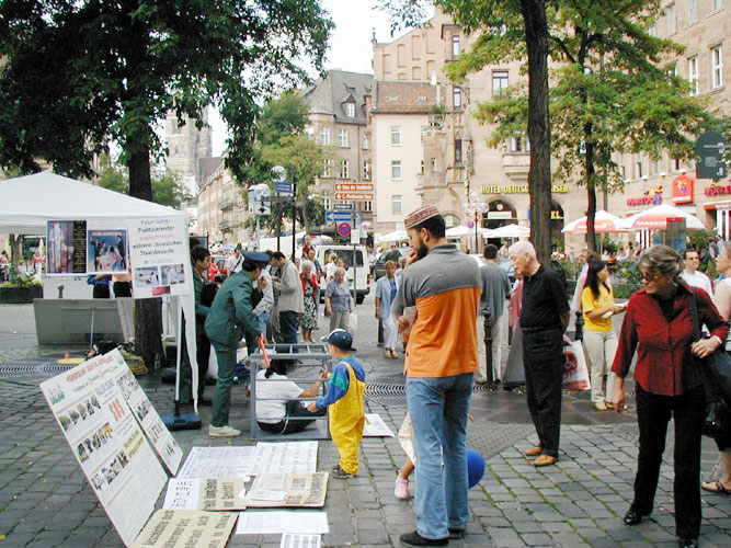 【明慧网二零零四年九月十八日】9月的德国秋高气爽,也是人们户外活动的最佳时节。正逢纽伦堡的城市节,老城的大街上人流穿梭不息。2004年9月11日,巴伐利亚州的学员借此良机,向当地有关部门申请信息日活动以讲清法轮功真象,并向广大公众展示每天在中国发生着的酷刑。同时,我们也征集支持法轮功学员以种类灭绝罪起诉江泽民的签名。