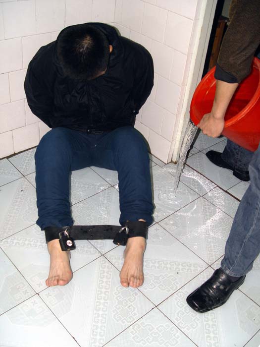 大庆一大法弟子在北京怀柔看守所遭遇此酷刑。先将其鞋袜扒光,穿着棉衣裤,扣上带锁的手铐,砸上36斤的死刑犯用的脚镣,并在胸前用刑具将手铐、脚镣穿起,使其身体只能一个姿势不能动。先在门边厕所通风口的低洼处放水,再将其置于水中,指使犯人轮流续水。待衣服吸满水略干后再浇水,使水源源不断的渗入体内。此刑长期浸泡使其全身肿胀、发白、变囊。极其痛苦生不如死。