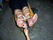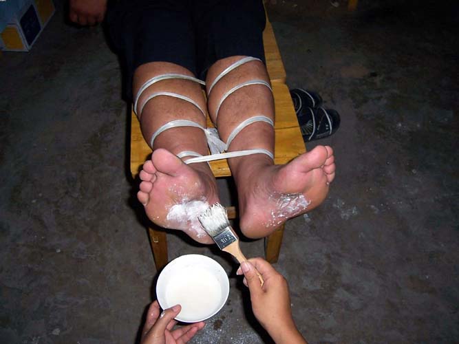 ![]() 图一:火碱和水刷脚心 | ![]() 图二:打火机烧脚心 |