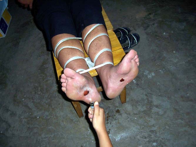我绝食第11天,恶警孙红利把我抬到一间没有人的库房,在他的指使下我被绑在一个长条椅子上,恶警们说:“一会儿有你好受的。”他们让看守所的犯人把我的鞋、袜子脱了,然后用小刷子沾上火碱和水刷我的脚心,这种火碱会把人的皮肤烧烂的,可见他们是多么的没有人性。刷了一会儿觉得没有他们预料的效果,后又指使饶阳县一名叫志刚的犯人拿打火机烧我的脚心,断断续续烧了我半个小时,把我的脚心烧起了2个枣一样大的泡。还往我的嘴里灌特浓的盐水,弄得我嘴里都是盐粒。整个迫害过程我都咬牙忍受着。那种痛苦、折磨让人无法承受,这都是在恶警孙红利的指使下進行的,他还大叫:“你不吃饭,不吃饭你死了马上火化。”