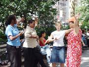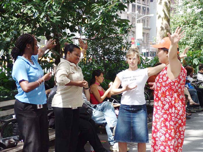 ![]() 功法演示 | ![]() 一些民众被现场的功法表演所吸引,当场学炼起来 |