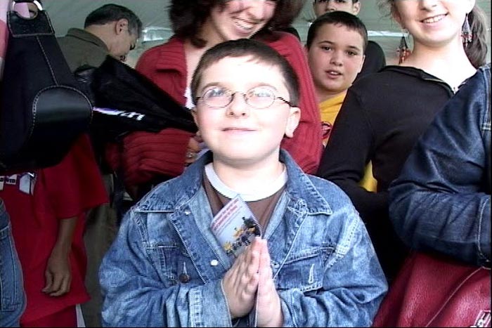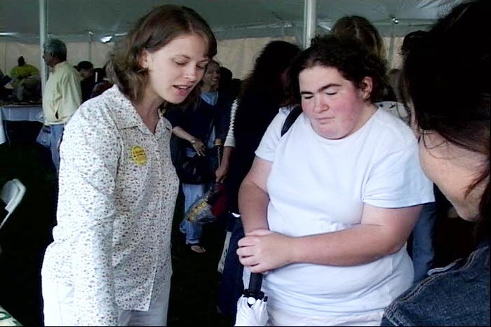 哥伦比亚大学250周年 |  对法轮功修炼心生向往的男孩 |  法律学院的艾米利不时的向驻足停留的人们介绍法轮功 |