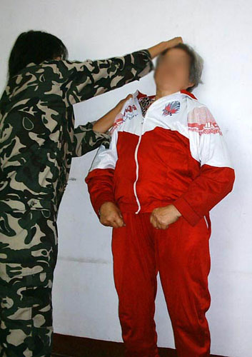 图1-1:马三家教养院队长黄海燕打法轮功学员石胜英10多个耳光,石胜英的脸被黄海燕的指甲划破,眼里也充了血。黄海燕又向下按石胜英的两肩呈蹲下姿势。