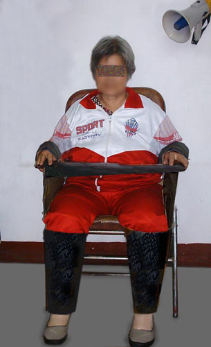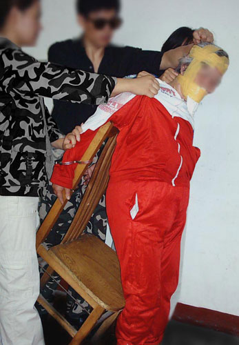 图2-2:用手铐将石胜英铐在一个大木椅的椅背上,10多个人狠命的将她往楼内拖拽,腰部随时都有折断的可能。