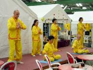 于是,法轮功学员们精心装扮一番,为当地人带来了唐装表演,仙女舞蹈,吉他、小提琴合奏和演唱,小弟子们也跳起了星星舞。两位装扮成仙女的学员在舞台上打着“真善忍”的横幅作为背景,舒缓的音乐和表演与周围的喧闹形成鲜明的对比,仿佛一股清流,吸引着人们近前观看。发资料、征签的学员在旁边向观众解释,这是法轮功学员表演的节目。穿插在文艺表演之间,学员们表演了5套功法,并在台上通过麦克风介绍了法轮大法。