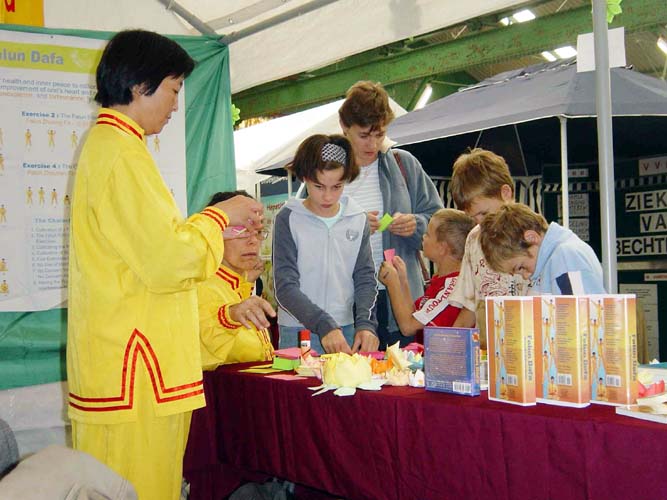 【明慧网2004年9月22日】2004年9月18-19日,比利时法轮功学员应邀参加了在比利时港口城市安特卫普举行的健康博览会。法轮功学员的展位处在一个很显眼的位置,大家用精美的纸莲花做装饰,墙上挂着法轮大法洪传世界的图片,让人们了解到法轮大法的美好与祥和,每隔一个小时左右,学员们就可以在展台上演示法轮功功法,优美的炼功音乐在大厅里回荡着。