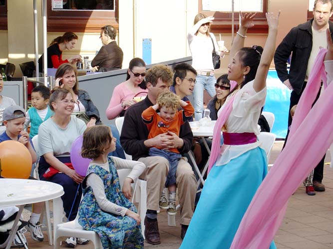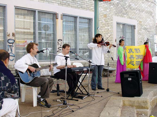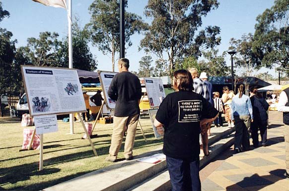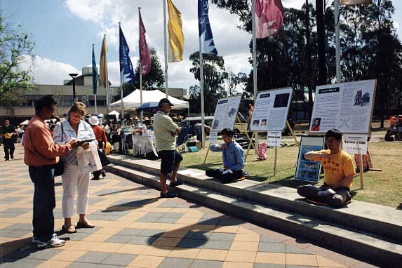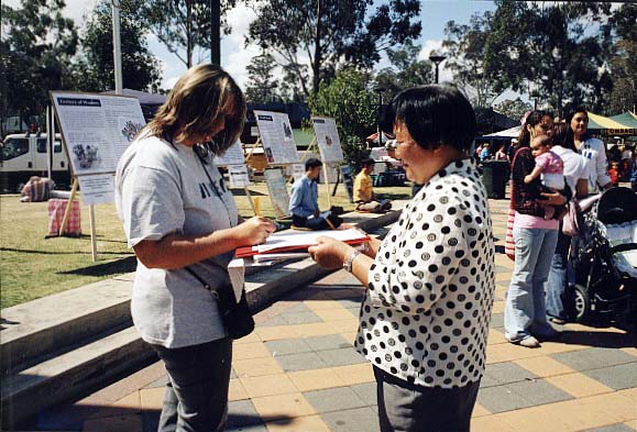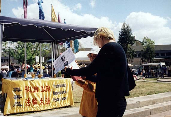 悉尼法轮功学员这是第三次应邀参加这一活动。根据活动的特点学员选择大型的酷刑展板和法轮大法洪传世界的照片展板,效果非常好。许多人来看展板,他们简直不敢相信在今天的中国还有(酷刑迫害法轮功学员)这样的事情发生。他们不断的向学员提问题,学员们也认真的回答他们,当他们明白了真象时就主动拿笔签名呼吁停止迫害。在附近玩的中学生一伙一群的过来看展板并签名。还有许人多马上打听在什么地方可以学功。