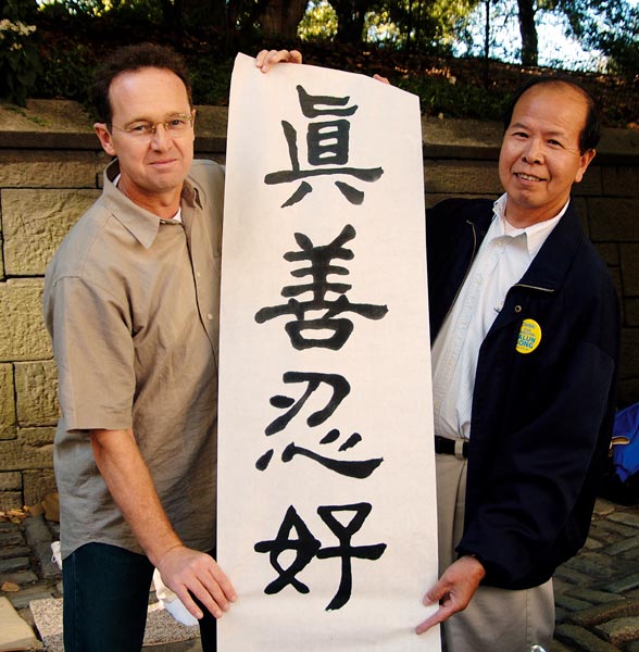 ![]() DAVID WILLSON(左)与陈汝棠先生拿刚写好的“真善忍好”字联 |