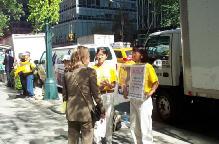 中午至下午两点,在曼哈顿第三大道上,从43街到57街,法轮功学员用“帮助停止迫害法轮功”、“法轮大法好”等黄底蓝字的小横幅、各式各样揭露迫害讲清真象的展板以及他们坚定的信念和不屈的精神组成了一道“勇气长城”。