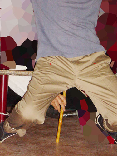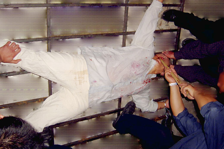 将大法弟子双手分开铐吊于铁床上,两脚分别铐于铁床底处,再将木椅倒置让其坐于椅子的铁筋上。恶徒将一长木棍支于肛门处。身体重量集中在木棍和铁筋上,长时间受此刑极为痛苦。或将大法弟子手脚均铐住,将其长时间罚坐于一固定悬空的木棍上。