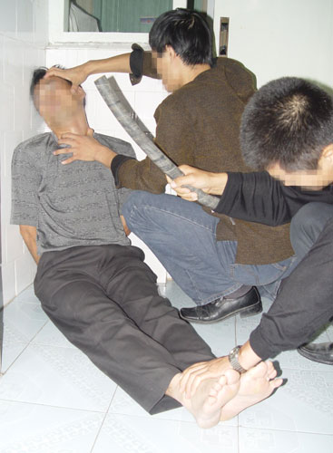 众恶人将大法弟子按于墙角,再用胶皮棒敲击小腿的胫骨,疼痛难忍。