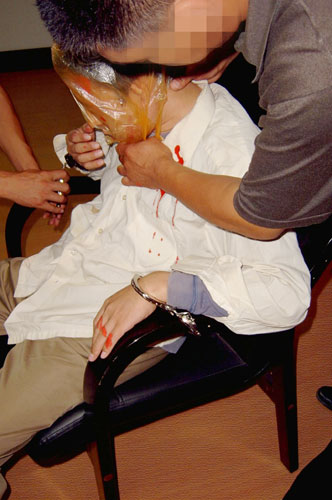 将大法弟子罚坐于铁椅子,手脚均铐住,再将塑料袋套其头部闷。痛苦、令人窒息。