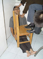 北京海淀区看守所将一大庆大法弟子挤于墙角,再将椅子置于腿部。几人踩住椅子按住头,一人用胶皮棒抽打其脚心。