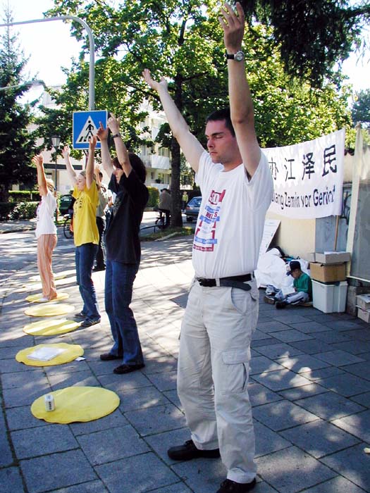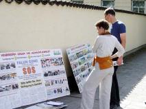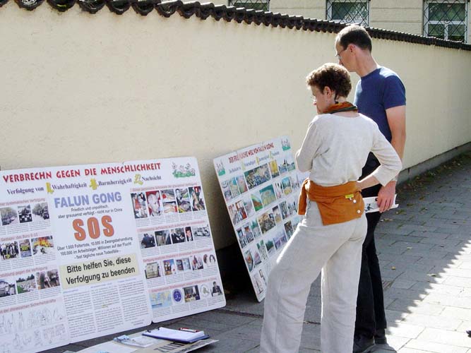 有位开车路过的女士特意停车,下来对学员们说,她2002年在玛琳广场(Marienplatz)就见到过法轮功学员们举办活动了,迫害都持续那么久了,还没结束?她还问,作为一个德国公民,她能帮法轮功学员做些什么。