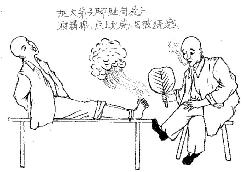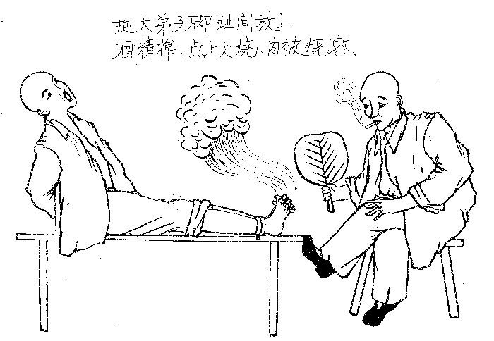 把大法弟子脚趾间放上酒精棉,点上火烧,肉被烧熟