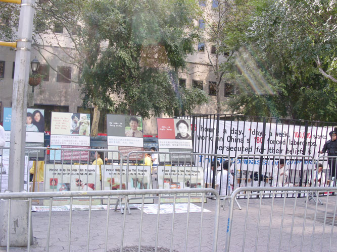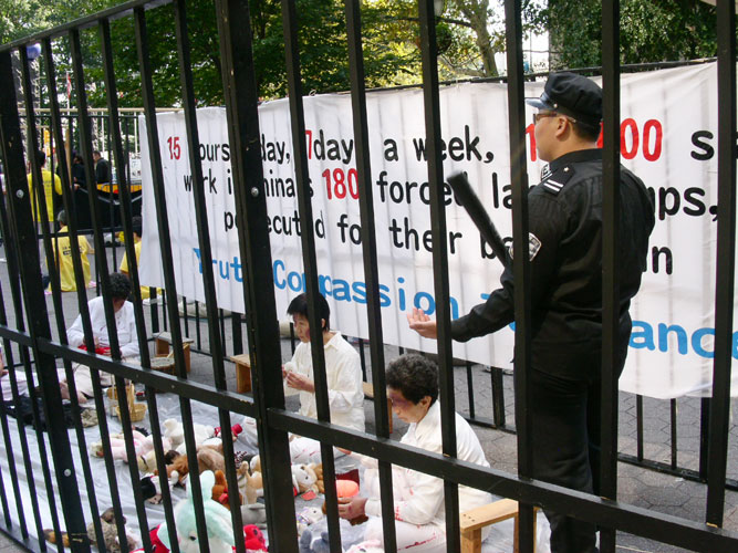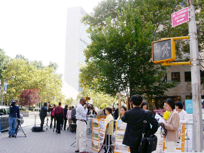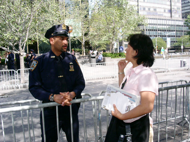 ![]() 部分来自世界各地的法轮功学员在联合国门前 | ![]() 向执勤的警察讲真象 |