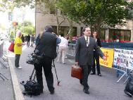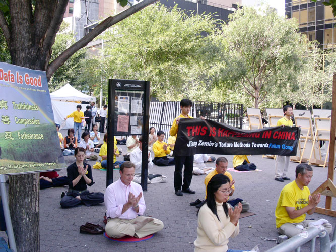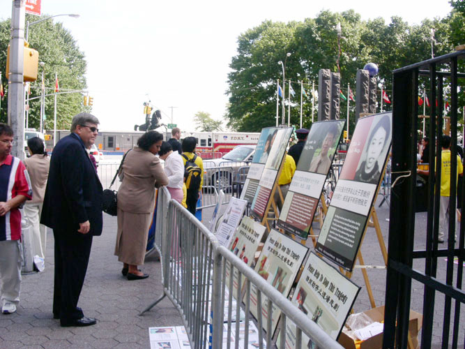 ![]() 有些参加年会的代表在观看真象。很多人表示以前不知道这么详细的内容。 | ![]() 一些媒体聚焦法轮功真象,久久不愿离去。 |