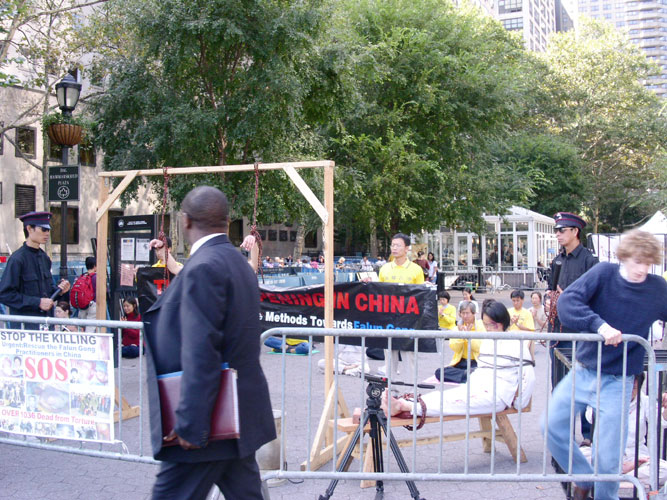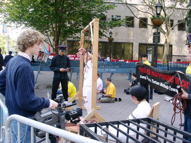 ![]() 演示被迫害得鼻青脸肿的法轮功学员做奴工的场面 | ![]() 酷刑展反映的只是中国发生的迫害的冰山一角 | ![]() 酷刑模拟 |