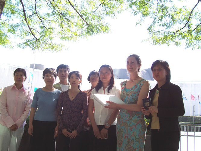 ![]() 新西兰法轮功学员在联合国大楼内请求与安理会主席见面 | ![]() 新西兰法轮功学员在联合国大楼前准备递交请愿文件 |
