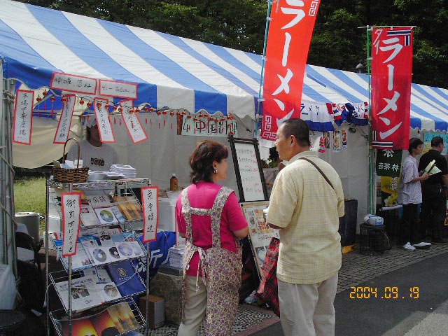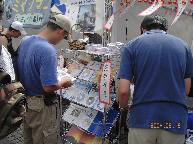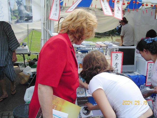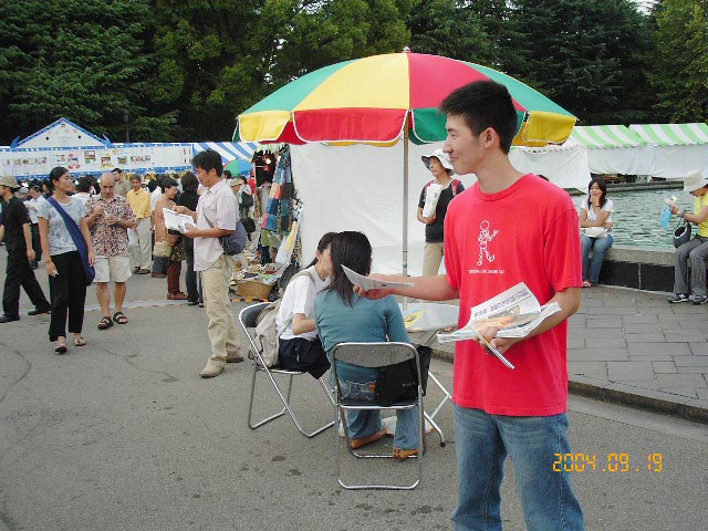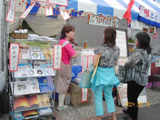 【明慧网2004年9月24日】2004年9月18日和19日,在日本东京都千代田区日比谷公园,熙熙攘攘的人群赶来这里正在举办的TOKYO ASIAN CITY FESTIVAL 2004 〈东京亚洲城市节日〉。在小音乐堂对面的广场上,有亚洲各国出场的饮食、服装、杂货等摊位,人们为着各自的喜好穿梭在其间。有一位在东京经营三家饮食店的干练大方的女士,亦在这人头攒动的场地里摆出了自家的饮食摊位,所不同的是,她家的摊位前除了设有供客人使用的桌椅,还摆有一个独一无二的法轮功真象资料架,单是文字就有日文的、中文的、英文的、韩文的,CD有中文的、日文的、有图象的、有音乐的,还有日文的五套功法图片文字介绍的彩色书签。一台电视和CD机不停的交替播放着天安门自焚和历史的审判及大法真象歌曲。