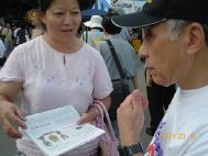 和以往洪法讲真象活动有着明显不同的是,过去几乎都是大法弟子发放资料,而现在我们看到的是不仅仅步行者们纷纷地接资料,很多人自己在资料架前主动的选取自己想要的内容,他们不再象过去接资料时留有几分迟疑和担心,而是一双寻找的眼睛和一只大胆的手自己挑选了。有日本人说NPO(日本法轮大法学会)申请的好,我们能放心的了解你们了,还问他家附近的炼功点在哪里他想去学;有中国人带孩子露出掩饰不了的紧张眼神从正在播放自焚的银屏前走过,正在我们为他们担忧的时候,转眼间他们又返回银屏前放松的看了起来;有美国人拿着自选的CD还在摊位前听懂英文的日本人大法弟子的介绍;也有许多人先买饮食再拿真象资料的。