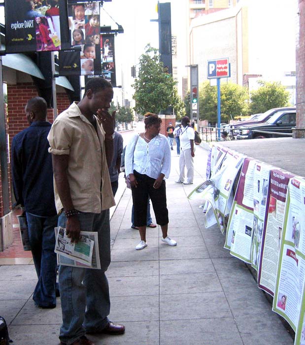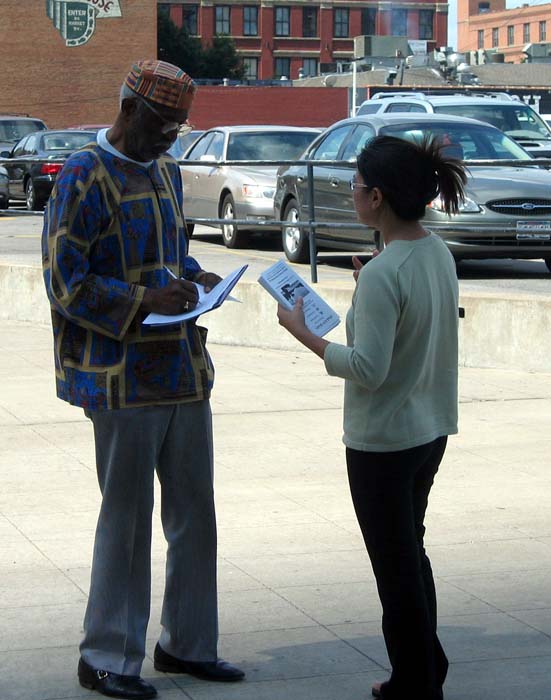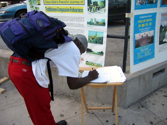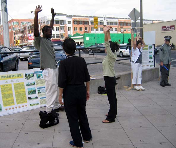 就象每次的活动一样,学员都会遇到有缘要学功的人。一位妇女在教功图片前自己就照着比划起来。一位男士说早就听说过法轮功,就是没时间学,几天在这里把学员们摆的图片一张一张的看,一位学员在旁边为其解释,他说有时间要去炼功点学功。另外一位年轻的黑人小伙子当场就叫学员教他炼功。