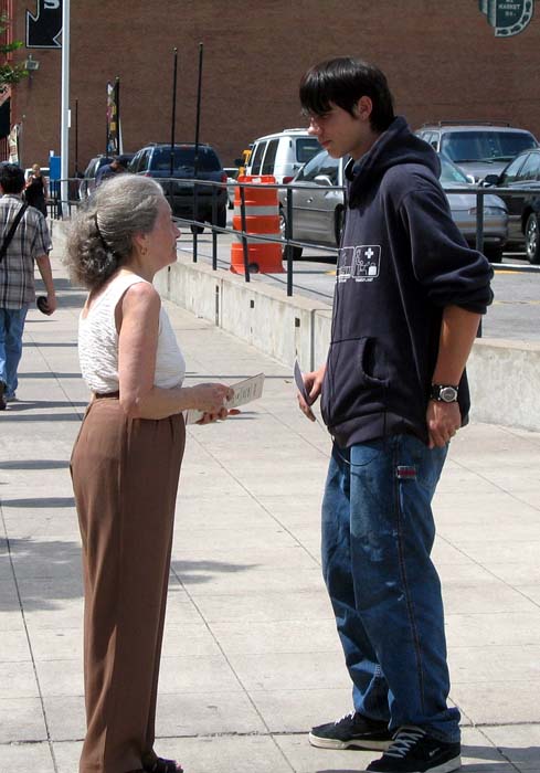 经常看到人们停在演被迫害的学员面前去问问题、关心学员,学员告诉他们:这就是正在中国大陆发生的事情,情况比我们能演示出来的要糟得多,许多善良的人们就是因为按“真、善、忍”去做一个好人而被折磨迫害致死。希望大家帮助停止这场迫害。