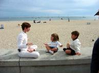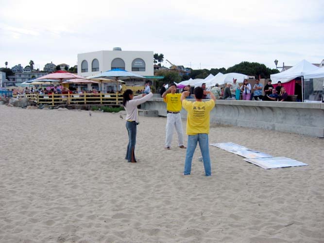 学员们结束了在集市的活动后,又前往附近的凯彼特拉市(Capitola )向那里的居民和游客讲清真象。凯彼特拉市在旧金山以南80英里,是滨临太平洋的海滨旅游城市,以海滩景点著称。那天该市正好在举办规模盛大的“艺术节和酒节”。几千名居民和游客在城区和海滩漫步。学员们来到海滩,展开大法横幅和展板。一部分学员在海滩上炼功,其他学员向游客散发传单。很多人,包括小孩,都想要学功,其中还有一个年仅3岁的小孩。