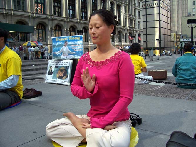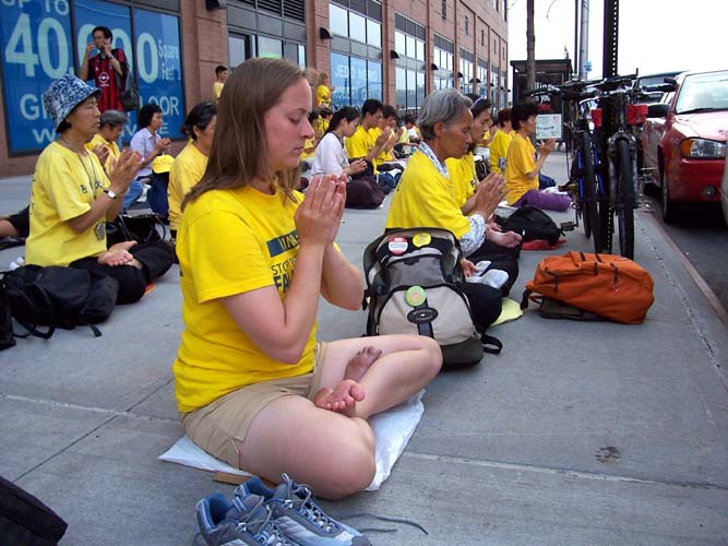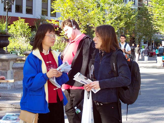 一位路人说,“法轮功炼功打坐是和平的,我不明白中国[江氏集团]怎么会这样对待你们。”学员告诉她说,人们炼功来强健身体,并按照真善忍做好人,很多人觉得功法好,都希望学炼李洪志老师传出的法轮功,但是中国当时的领导人江××出于小人的妒嫉心,容不下人们这样做,结果它利用权力发动了这场迫害。导致至少一千多人被折磨致死。