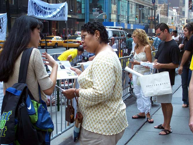 许多纽约人在了解了真象后,有的主动拿出钱来要提供帮助。有的人问学员怎么能够提供帮助。还有的人问,你们只要我们把真象告诉我们的朋友,写信给政府官员,这样就能停止屠杀吗?学员说,如果一个人做了坏事,杀了人,他最怕的就是让别人知道。如果全世界的人都知道江××发动的这场残酷的迫害,中国的迫害就会停止。而且人们也不会愿意与邪恶的人打交道。路人听了后说,“我明白了,我会告诉我的朋友。”