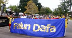 ![]() 法轮功的队伍 | ![]() 小弟子手持真善忍横幅经过主席台 |