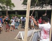 这次学员还发现了一种布制展板放置的小窍门:为防止展板易被风吹倒,布制展板不要绷的太紧系在框架上,松一些可以使得布制展板在风大时能够起伏,减少框架受力。