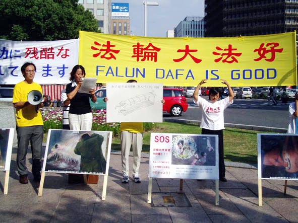 为了参加这次反酷刑真人模拟展,日本大法弟子克服困难,从各地赶到名古屋,在两天的反酷刑展中,向广大的当地民众讲述了在中国发生的对法轮功的迫害。两位日本大法弟子不间断的用扬声器向路人讲解着在中国发生的对大法弟子的种种酷刑和大法真象。