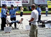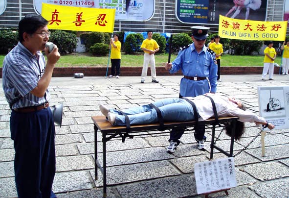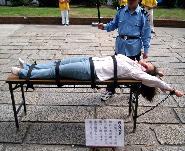 ![]() 金子容子在向民众说明自己所遭受的“死人床”酷刑 | ![]() 真人演示的“死人床”酷刑 | ![]() 日本学员在向民众介绍“死人床”酷刑 |