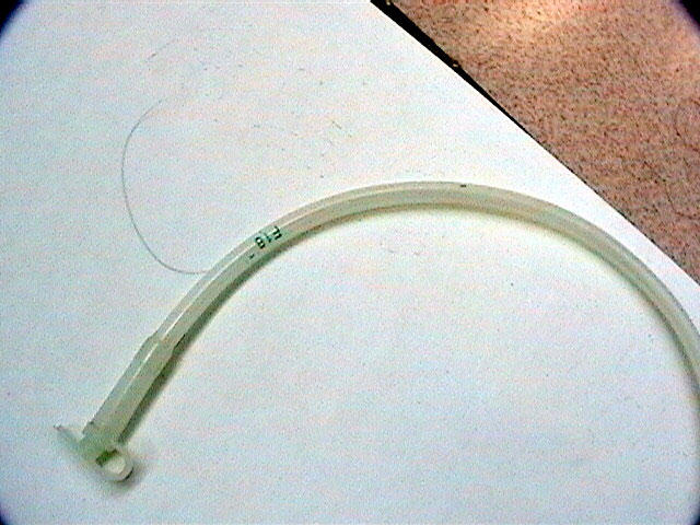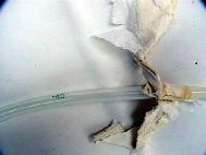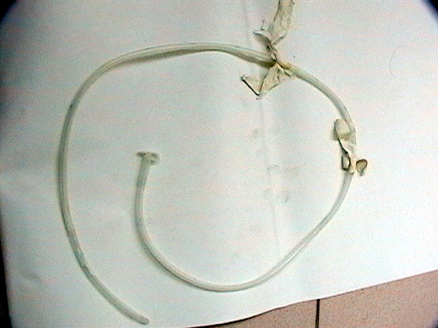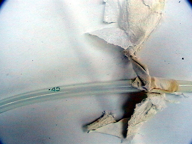 以下图片是张剑波被劳教所灌食用的插管,当时张剑波的家属去看他的时候,这个插管还插着。在家属要求下,才被拿下来。插管长约110cm,在标有45、55之间是一个固定胶布,说明插入50cm。